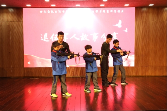 退伍军人故事分享环节寓教于乐,富有深意。我校退伍军人研究生田尧、刘新元迈着正步登台,与同学们展开面对面交流。小朋友们带着对军营生活的好奇与向往,踊跃举手提问。刘新元分享了军营的趣味经历与班长的暖心教诲,以小见大诠释军人担当;田尧则聚焦“和平是什么”,结合历史与今昔国防,紧扣时代阐释历史真理,引导同学们珍爱和平。随后,两位退伍军人现场演示站姿持枪与跪姿持枪等基础军事动作,并指导同学们亲身体验。