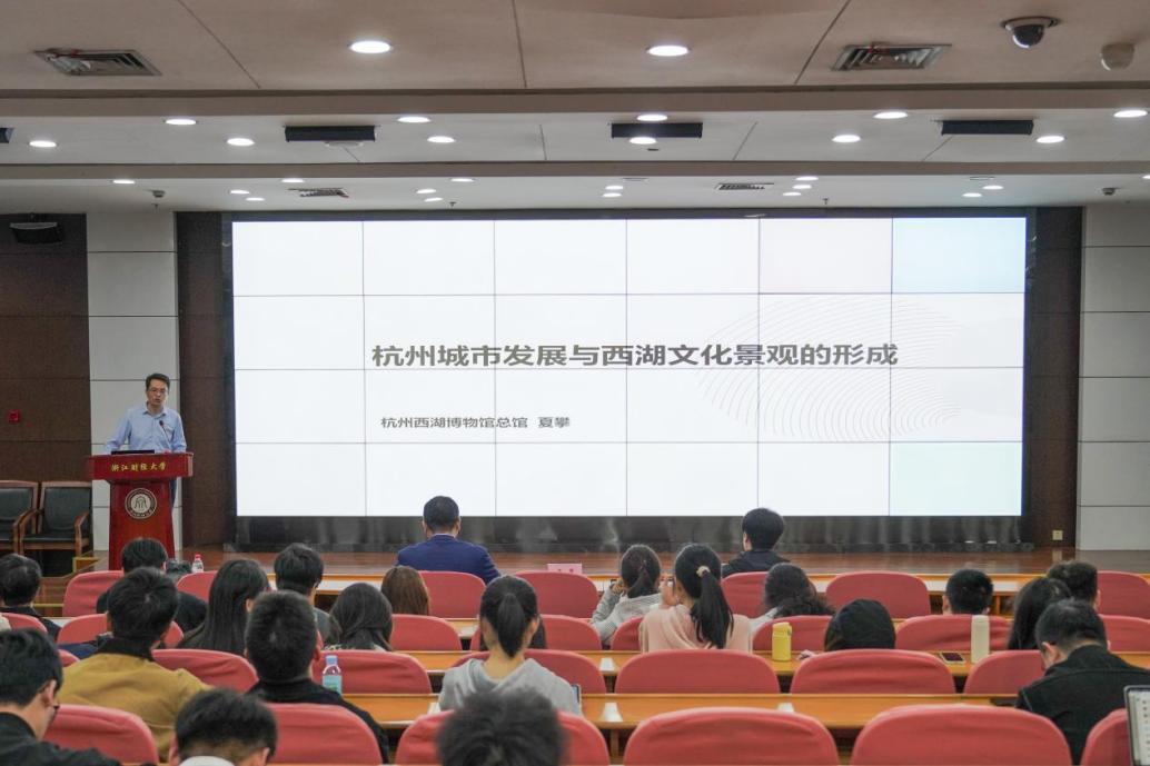 4月9日下午,研究生“博文系列讲座”第四十七讲在学术中心第二报告厅开讲。杭州西湖博物馆总馆副馆长、文博副研究员夏攀为我校研究生作题为“杭州城市发展与西湖文化景观的形成”专题讲座。活动由党委研工部副部长、研究生院副院长金国锋主持,150余名研究生参加讲座。