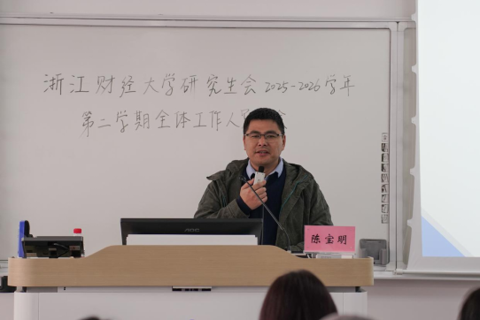 陈宝明老师在讲话中对校研究生会上学期的工作成效给予充分肯定,并对全体成员的辛勤付出表示感谢。他围绕下一阶段工作提出两点希望:一是要强化协同联动,进一步加强部门间沟通协作,凝聚工作合力,推动各项任务高质高效落实;二是要发挥表率作用,全体研会成员要以更加饱满的热情投入工作,以实际行动彰显榜样力量,不断筑牢研究生会的良好形象。