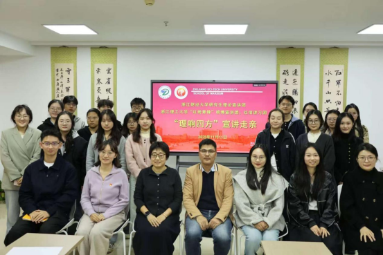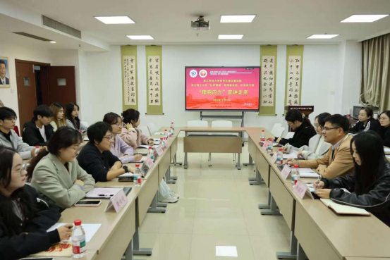 11 月 11 日下午,我校研究生理论宣讲团赴浙江理工大学,与该校“红研青锋”硕博宣讲团、红信讲习团开展深度学习交流活动。浙江理工大学党委研工部思政科科长、“红研青锋” 硕博宣讲团指导教师钟利彬,马克思主义学院院办主任、红信讲习团指导教师杨艳琼,我校党委研工部学生工作主管陈宝明,马克思主义学院博士、研究生理论宣讲团指导教师郑珺,及两校宣讲团成员共同出席。活动由浙江理工大学杨艳琼老师主持。