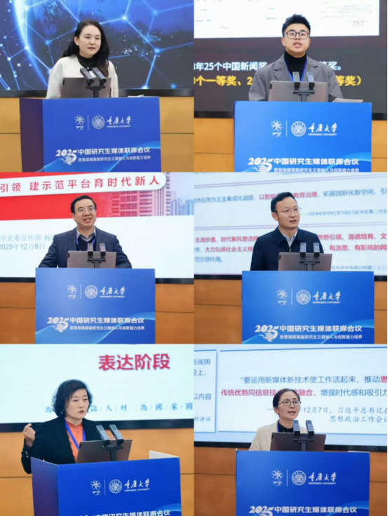 2025年12月8日至9日,由教育部学位与研究生教育发展中心指导、重庆大学主办的2025年中国研究生媒体联席会议在重庆召开。教育部学位与研究生教育发展中心主任王磊,重庆市教育委员会二级巡视员卢明伦,重庆大学党委书记、中国工程院院士王树新出席开幕式并致辞。开幕式由重庆大学副校长卢义玉主持,来自全国93所高校的250余名师生代表参加会议。我校研究会组宣部、新媒体部负责人受邀出席会议。